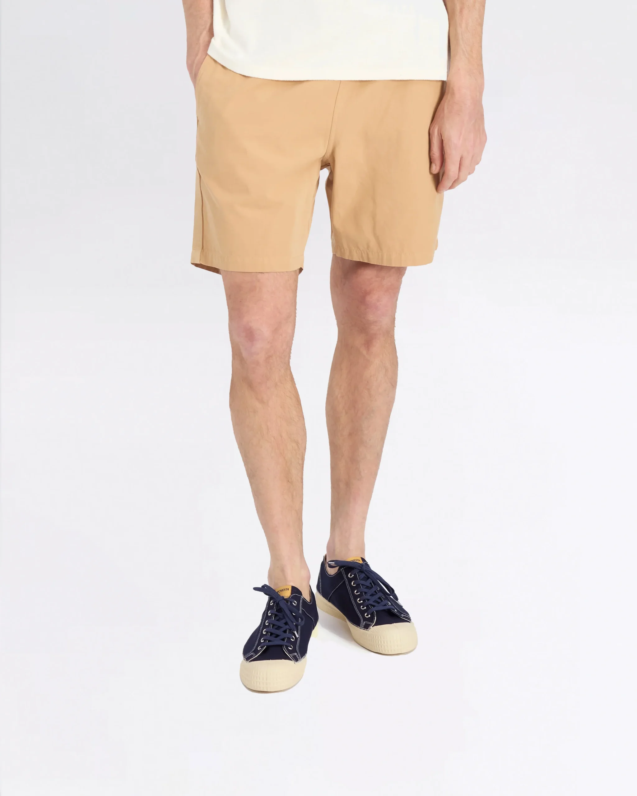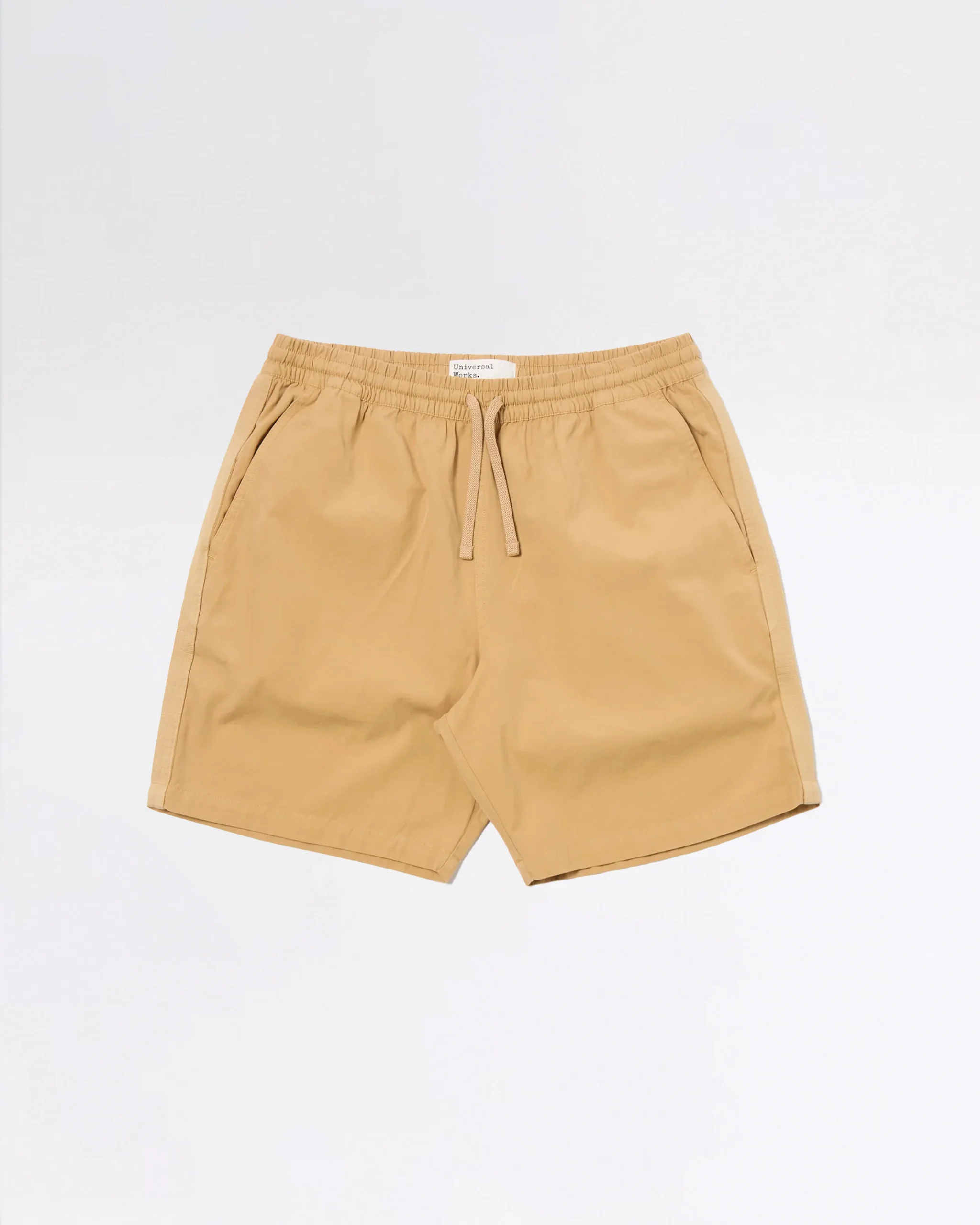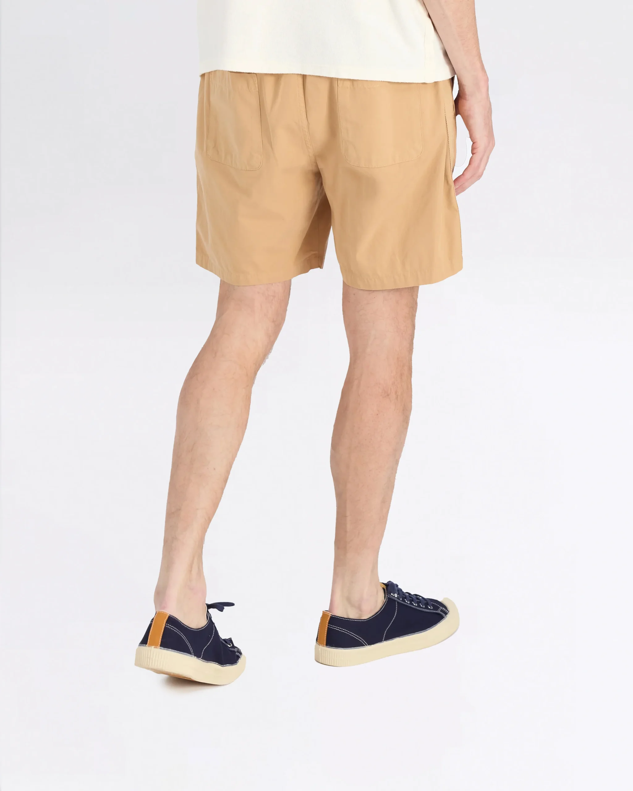 Le Beach Short est un short très confortable, s’arrêtant au-dessus du genou, avec une taille élastiquée et un cordon de serrage. Il présente une poche arrière à rabat asymétrique, un détail emblématique des premières collections de la marque. Pour cette version, une bande en chevrons surteinte, discrètement intégrée, a été ajoutée le long de l’extérieur de chaque jambe.